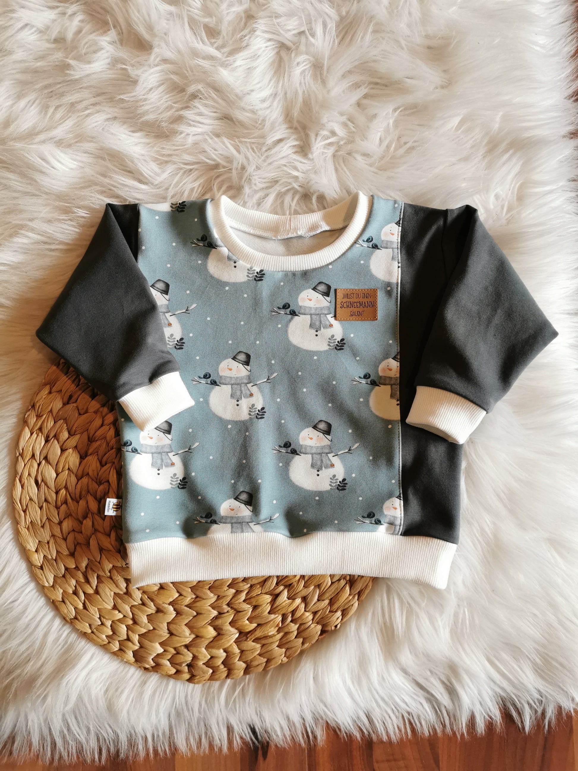 Ein Hingucker ist die seitliche Unterteilung mit farblich passendem Stoff. Das Kunstlederlabel "Willst du einen Schneemann bauen" rundet den Pullover ab.
