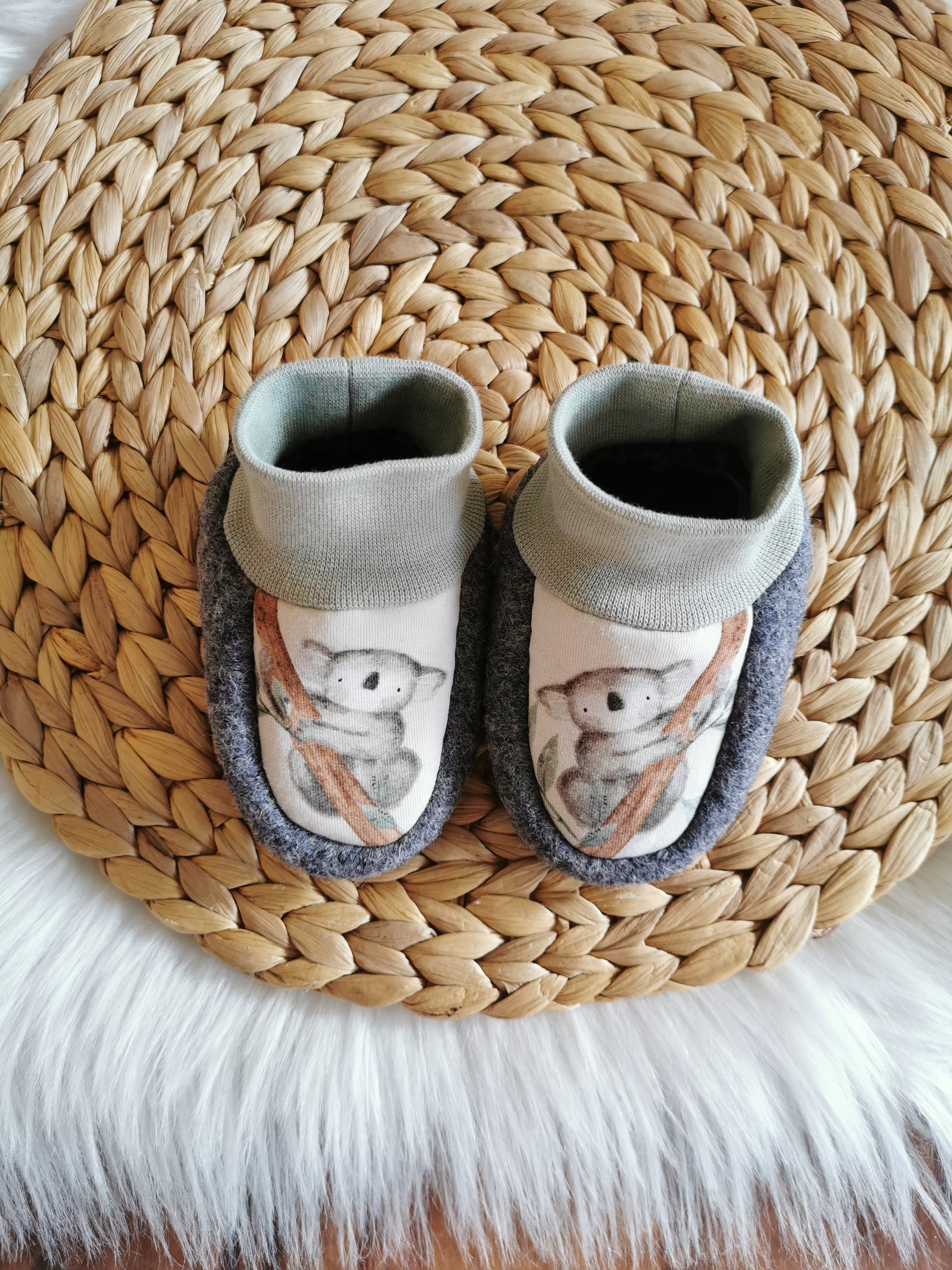 Diese Wollwalkpuschen sind wahre Schätze. Denn Wollwalk besteht aus 100% Schurwolle, wirkt temperaturregulierend und wärmt die kleinen Füßchen bis zu einer Temperatur von -15°C. Wollwalk ist zudem feuchtigkeitsabweisend und dehnbar, sodass die Schuhe einige Monate gut mitwachsen.